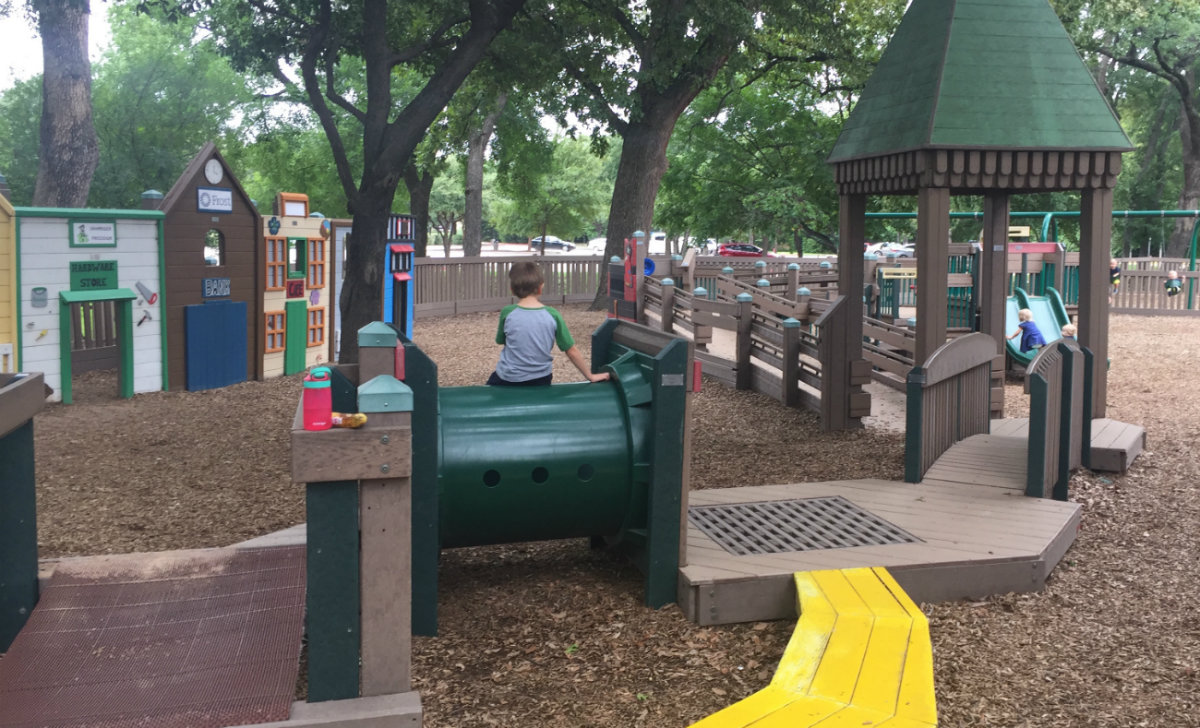 We love coming here because the shade of the trees really helps break the heat and makes this spot doable even on warmer days. It has the look of a wooden playground, but no splinters because it’s faux, and the ground cover is wood chips. We also love that there’s tons of seating for parents and caregivers to easily keep an eye on their kiddos.