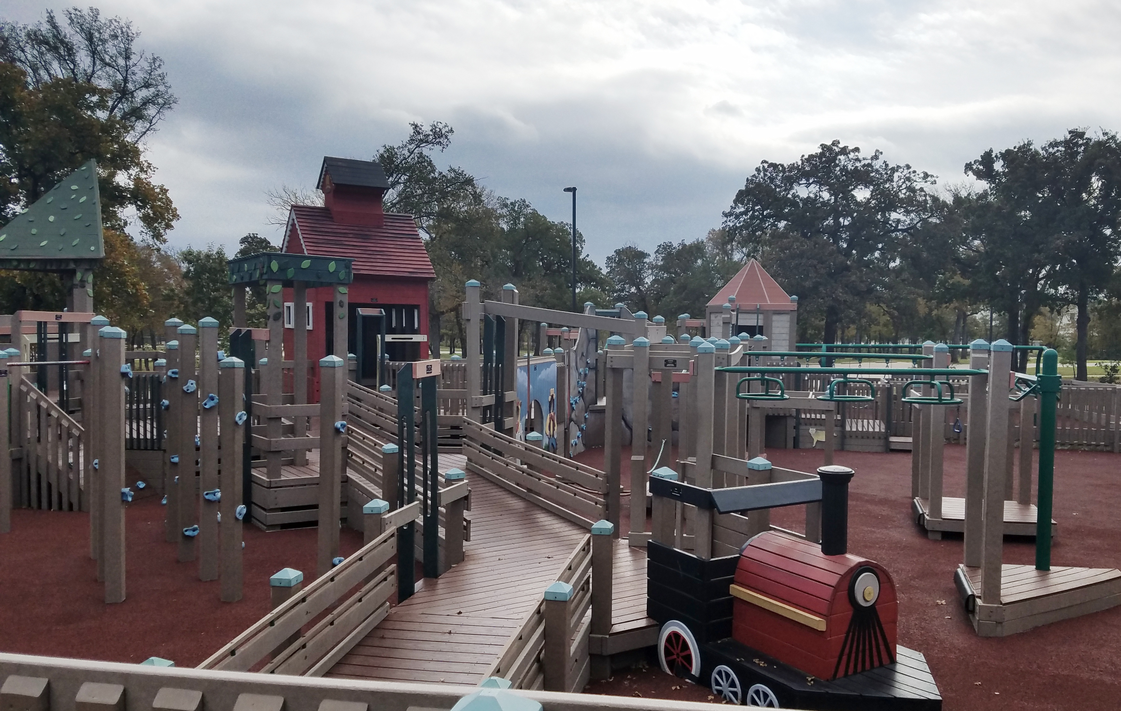 The playground is called Fort Wildflower, and it has a wooden, clapboard-style look throughout – on pathways, stairs, and climbing structures. One of the larger features of this playground is its bright red, old fashioned schoolhouse. Kids can play inside and underneath this building, and slide out of the second floor. There’s also an wooden express train and other play buildings/storefronts: a jail, general store, and cottage house.