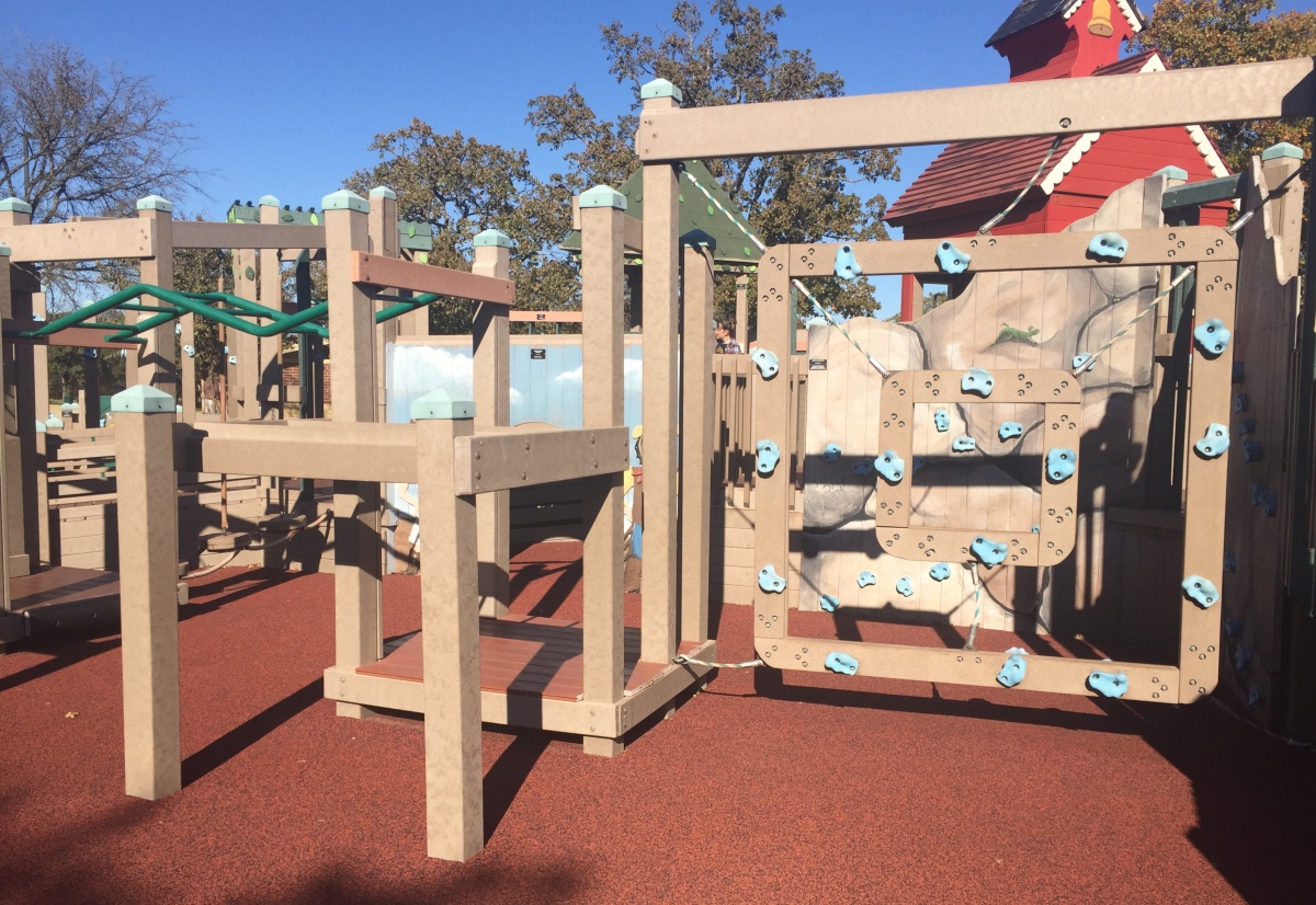 This is a large playground with lots of space for running, yet it’s almost entirely enclosed by a wall that runs along the outside perimeter. There is much for kids of all ages to explore here — rock climbing walls, a music station, various rope-climbing structures, monkey bars, swings and slides. The well-designed layout, with its winding paths, tunnels, and ramps encourages keep kids curious about what’s around the bend. The layout certainly entertains little ones for a long time.