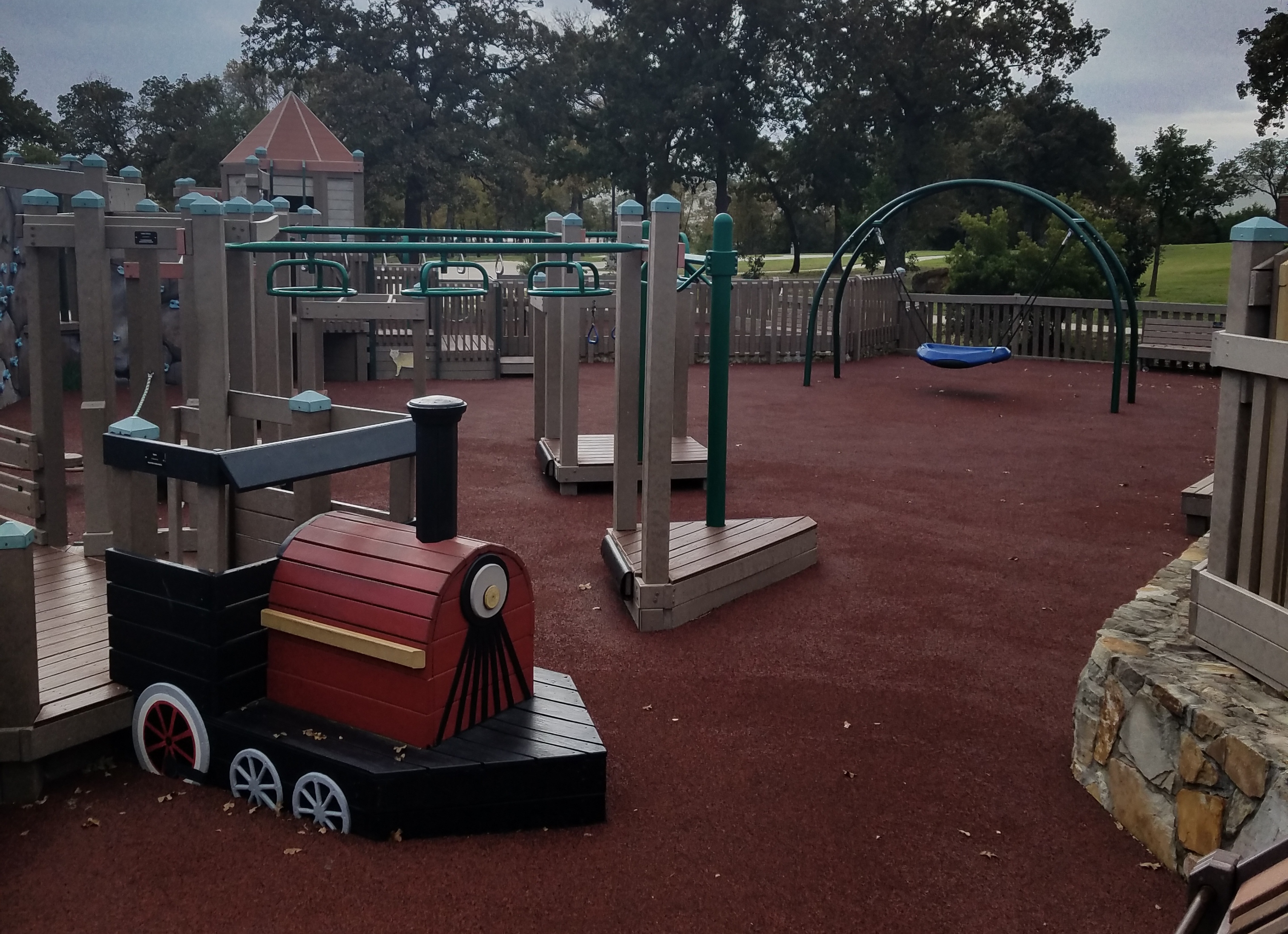 The toddler area (called the “Tot Lot”) is separate from the bigger-kid area by a wall, yet this other side of the playground is still visible from the Tot Lot. This toddler section is really well designed. It’s one of the safest we’ve seen in DFW. Rubber ground covering is found throughout the playground, perfect for toddlers prone to tripping.