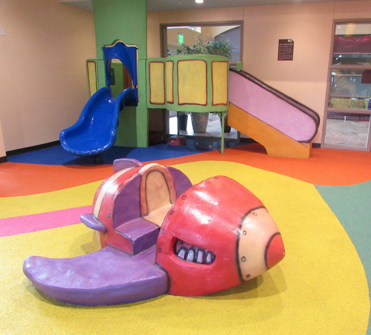 Parking and Entrance: The REC indoor playground is just inside the sliding glass doors, off to the right of the main entrance hallway.