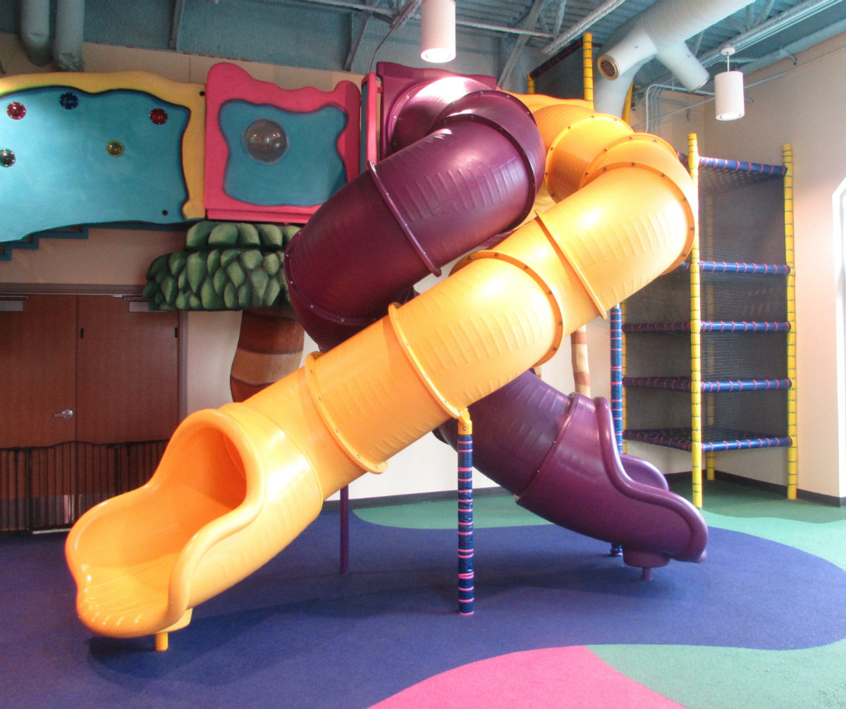 The REC indoor playground is a bright, fun, colorful, air-conditioned spot to bring kids! Its located just inside a large fitness center, but this section is open to the public.